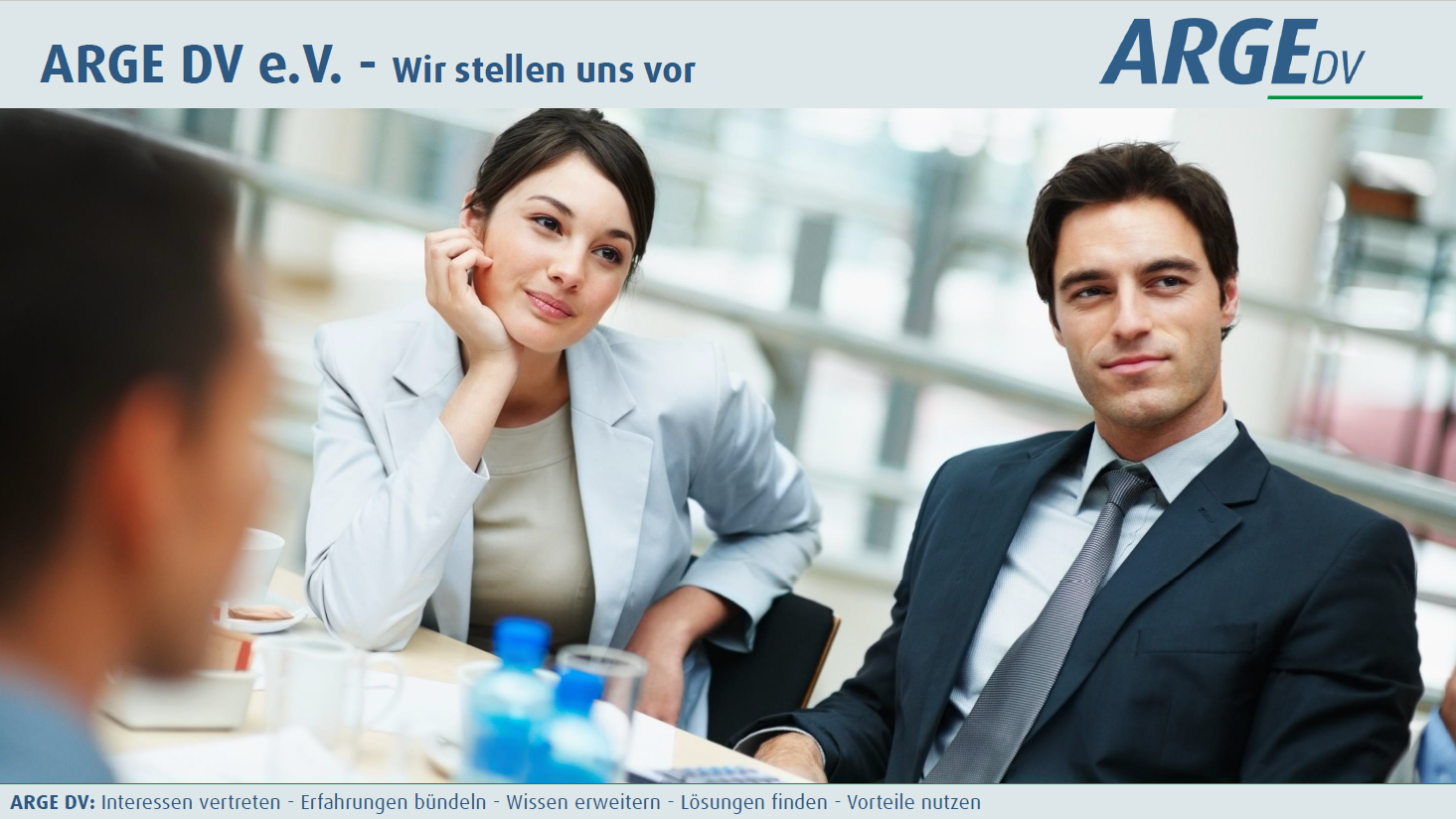 Der ARGE DV e.V. ist ein Zusammenschluss von über 50 Unternehmen und fördert die Interessen von Firmen im Bereich der Energiewirtschaft, der Trinkwasserversorgung, der Abwasserentsorgung sowie der Kommunalverwaltung mit Fokus auf EDV-Systeme, Geschäftsfeldentwicklung und Geschäftsprozesse.